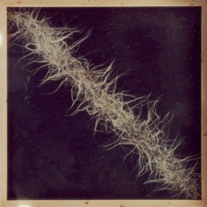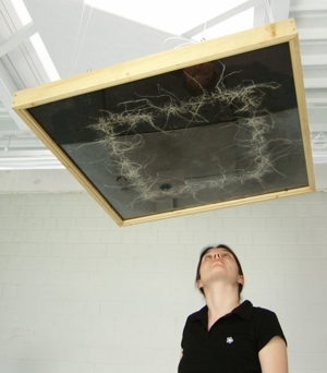 Material: Erbsensamen, Blumenerde, Holz, Glas, Stahlseile (110x110x15cm)